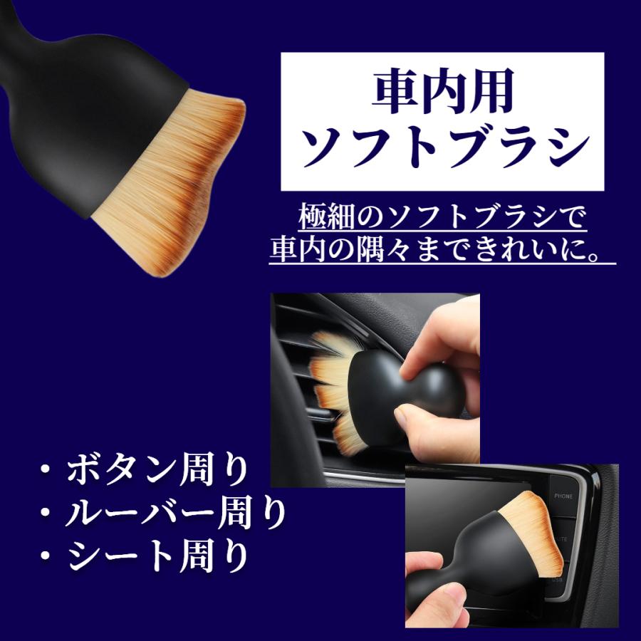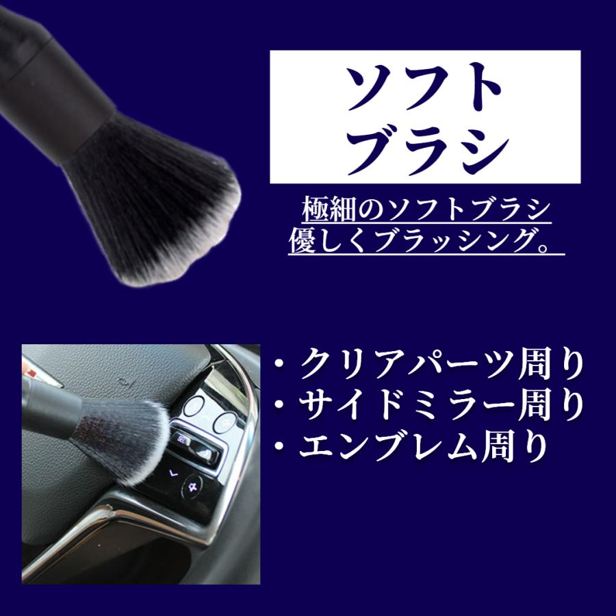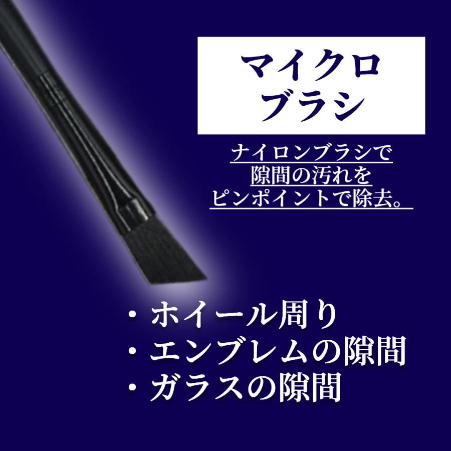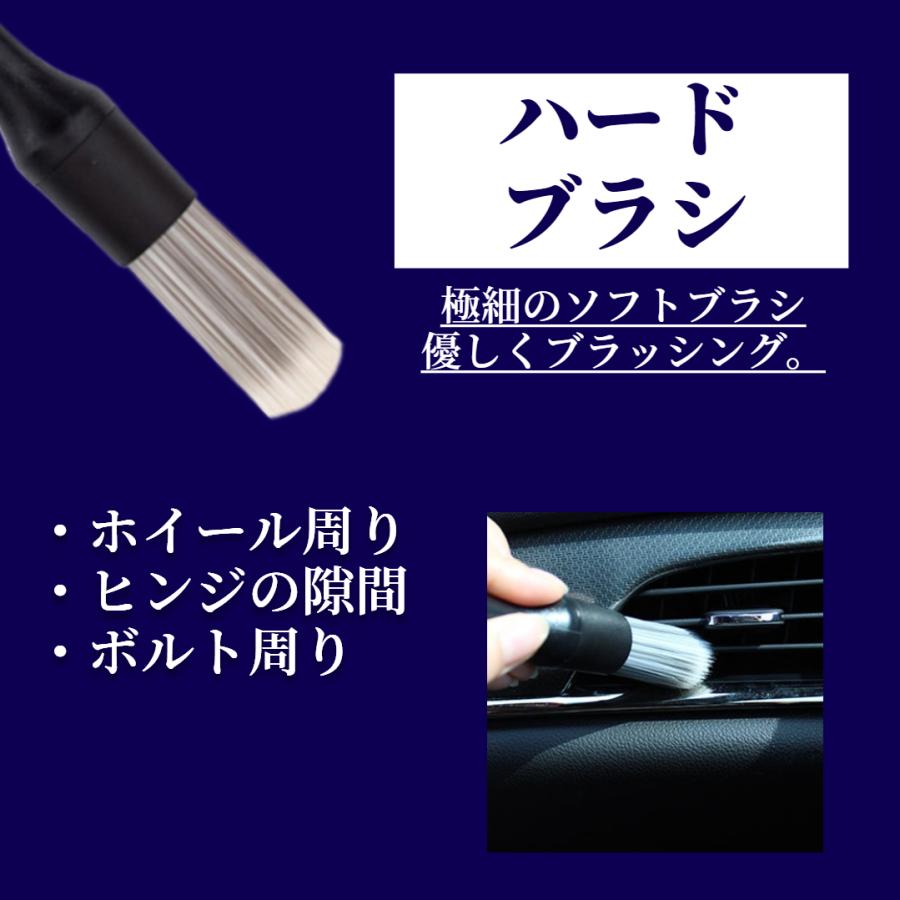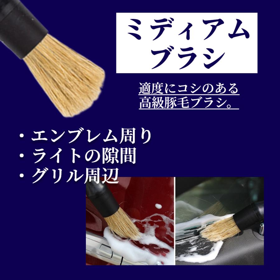 高級豚毛ブラシ。車のロゴ、グリルやヘッドライトの隙間などやや硬い部分の清掃に使用されます。