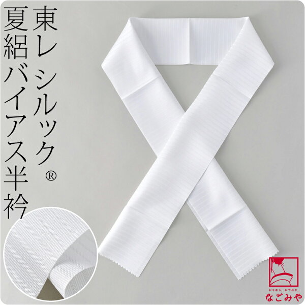 | 備考 | : | <!--ここに備考 -->衿元のラインがきれいに整うサマー半衿です。 バイアス半衿は、斜めに交差する特殊な紋組織で織られた生地を45度の角度でカットし、伸縮性と自然な絽目を実現しました。 画期的な45度の発想で、衿山のシワや波打ちを解消し、理想のラインを生み出します。 東レシルック(R)ノーブル快適新合繊を使用した上品な光沢。 シワ・黄変・カビ・虫くいになりにくく、イージーウォッシャブルでお手入れが簡単です。 汗ばむ季節でもすっきり清潔に、いつも綺麗な衿元でいたいですね。 礼装からカジュアルまでお使いいただけます。 バイアス半衿の縫製ポイントもパッケージに記載していますので、しっかり付けてきれいな衿元を実現してください。