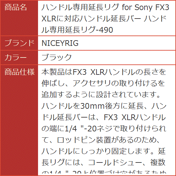 本製品はFX3 XLRハンドルの長さを伸ばし、アクセサリの取り付けるを追加するように設計されています。