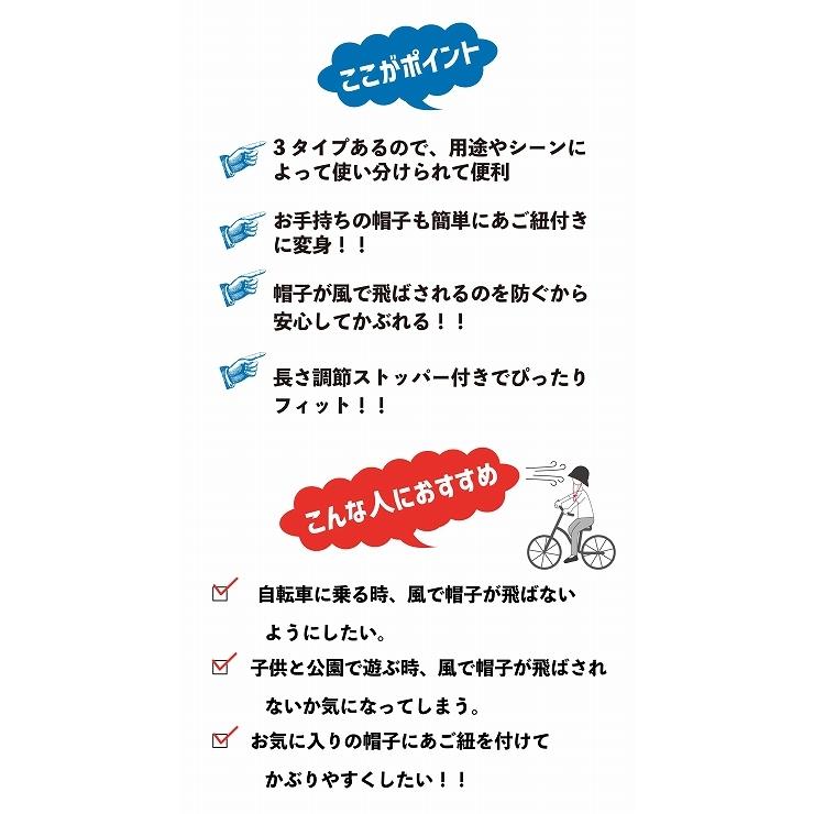 こちらのあご紐3種類セットは、風の強い日や自転車に乗るときに帽子が飛ばないようにする便利アイテムです。