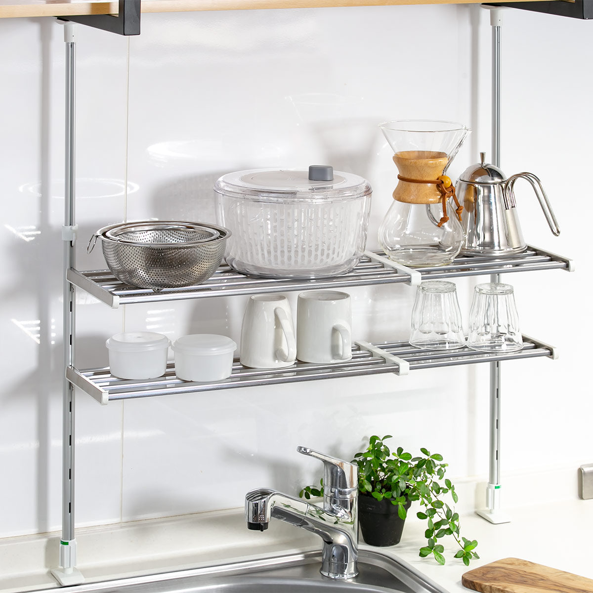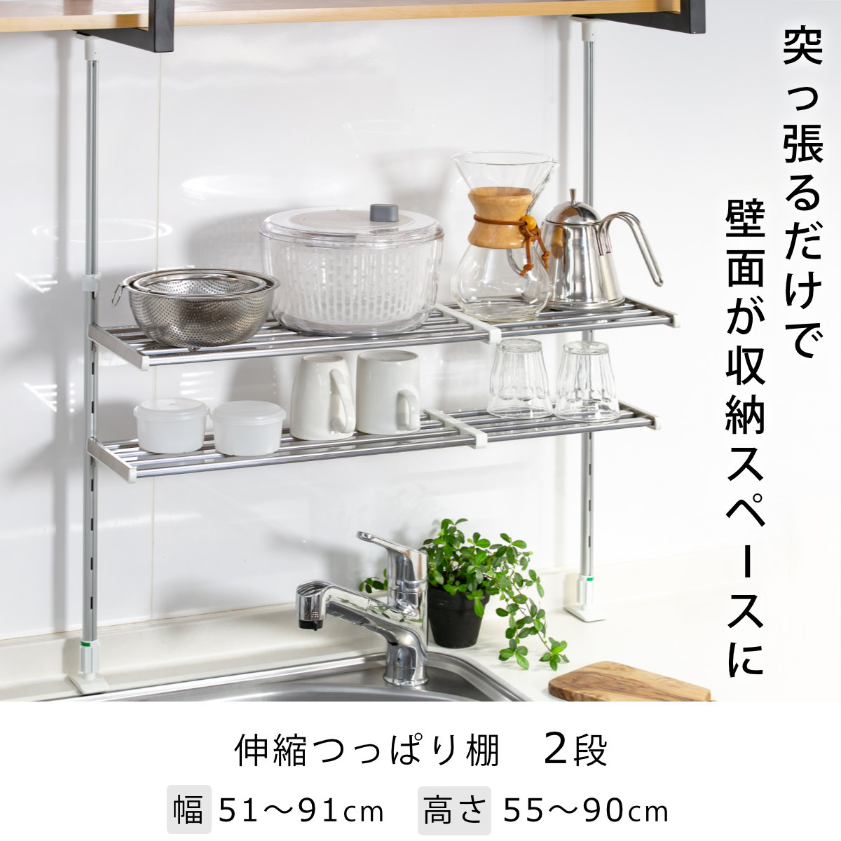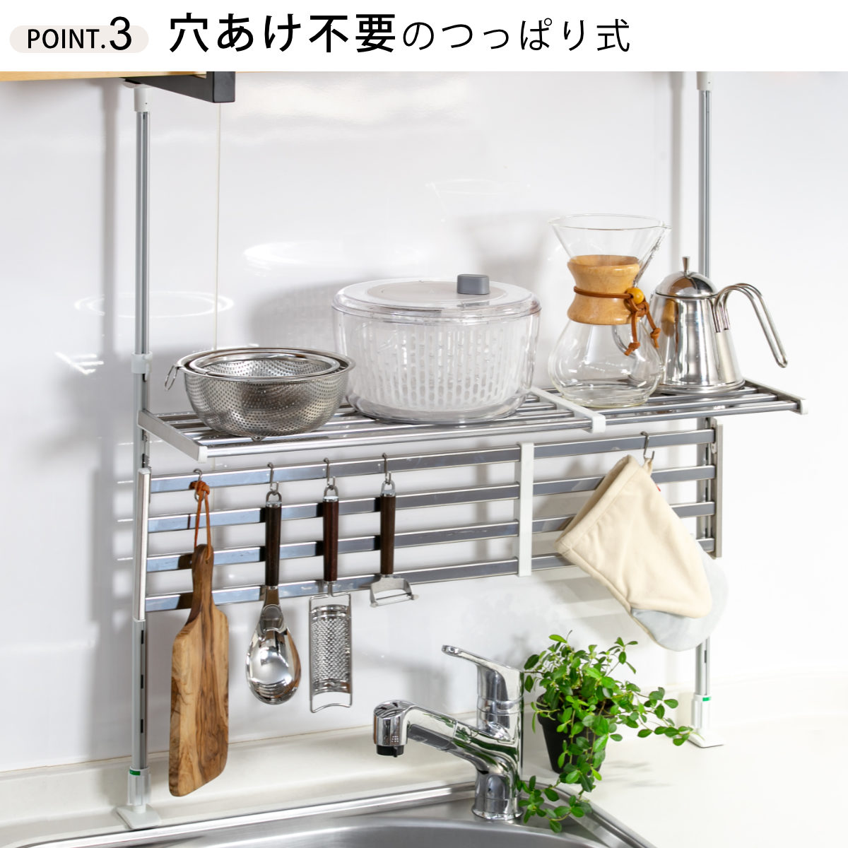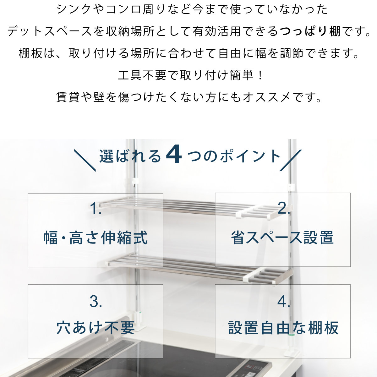 ●シンク上やコンロ上などキッチンまわりのデットスペースを有効活用できるつっぱり棚です。