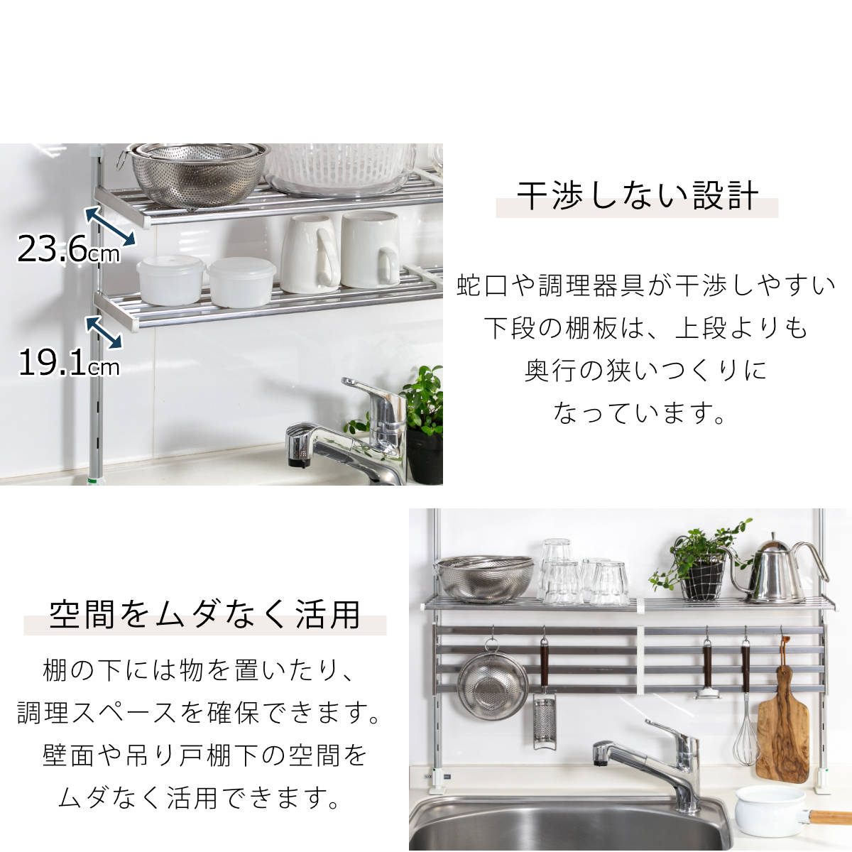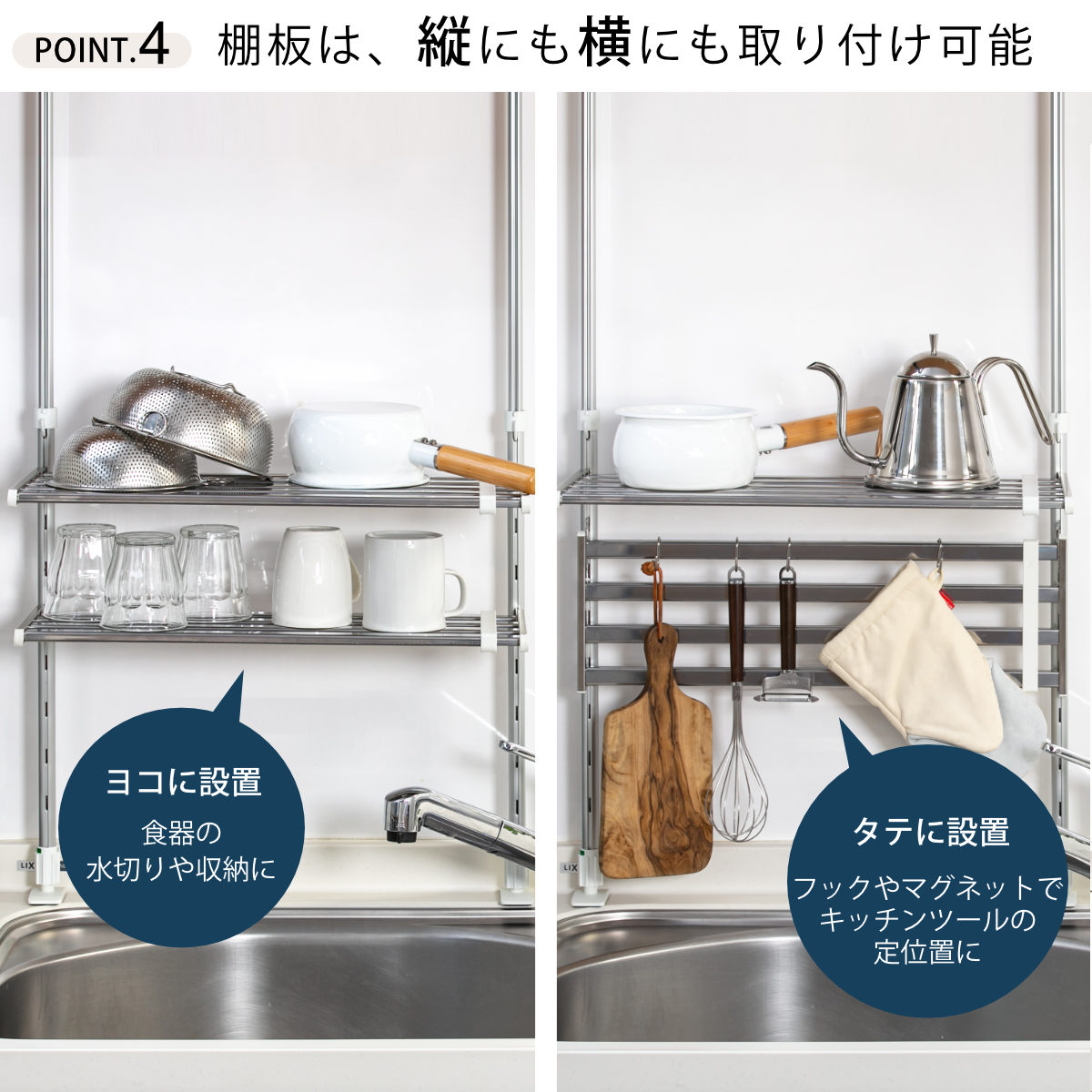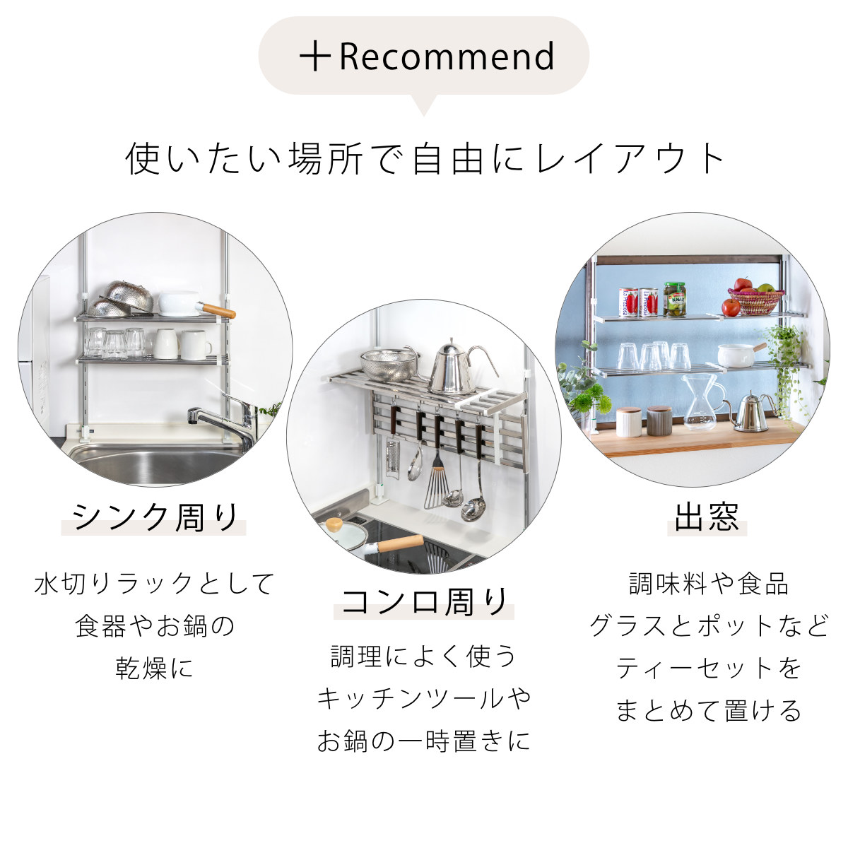 ●シンク上やコンロ上などキッチンまわりのデットスペースを有効活用できるつっぱり棚です。