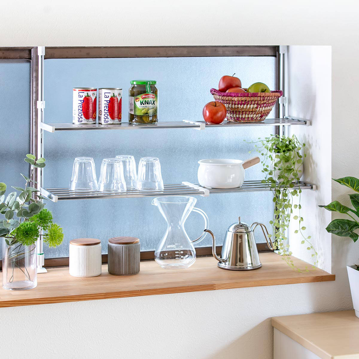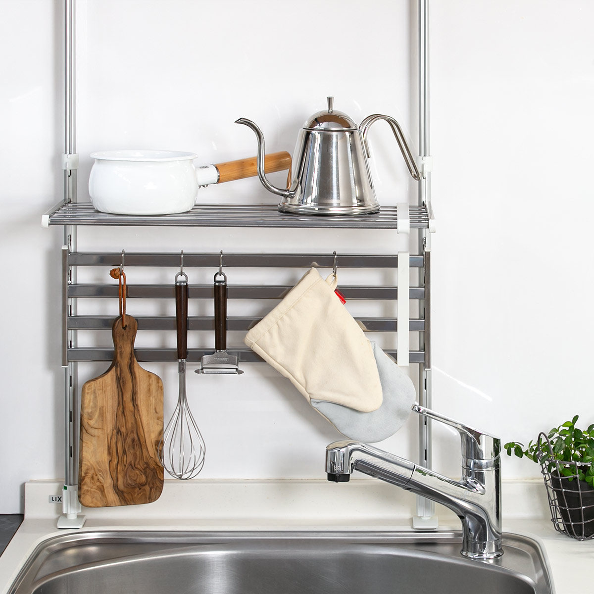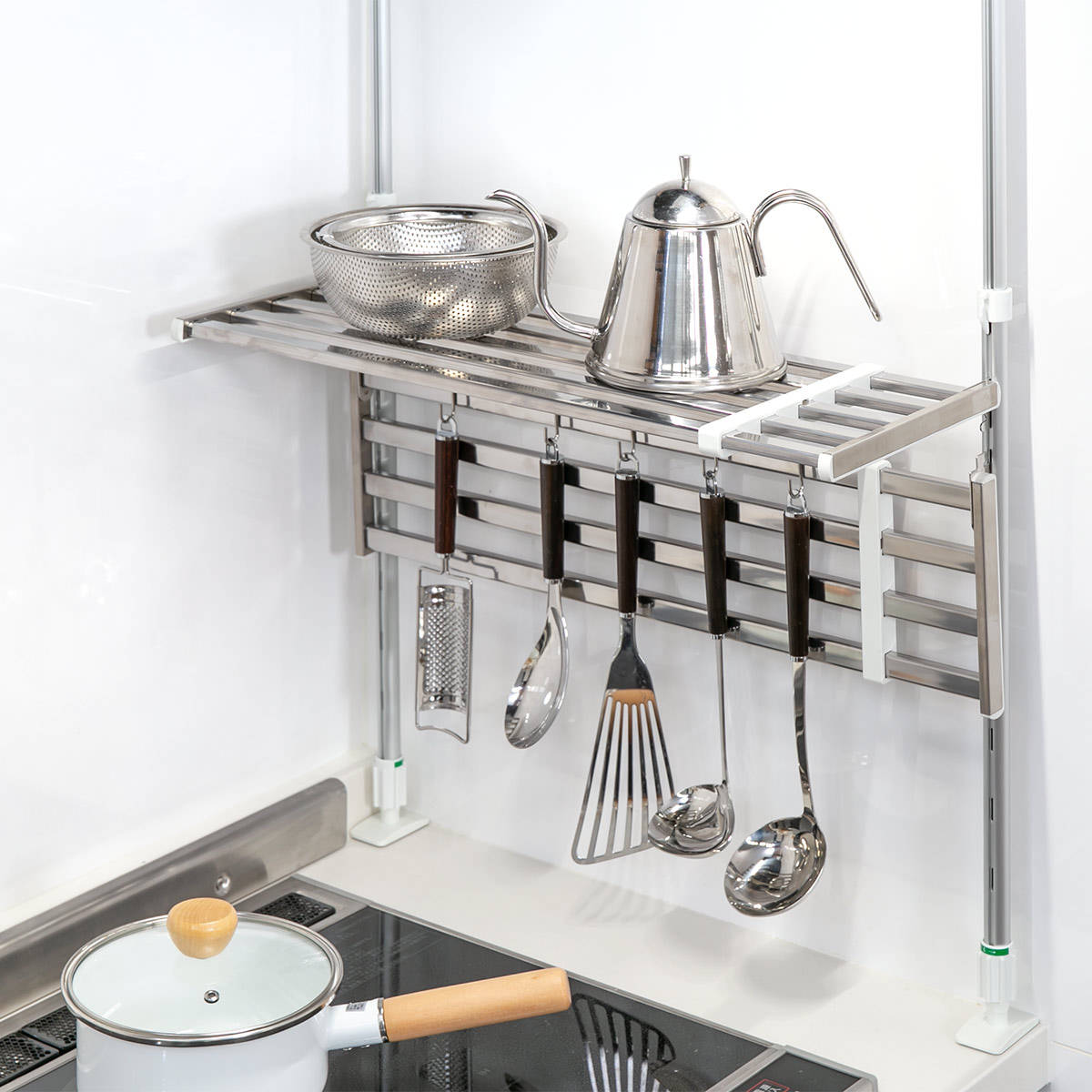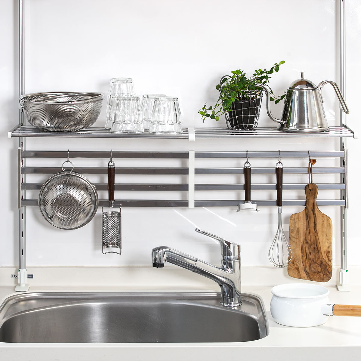 ●シンク上やコンロ上などキッチンまわりのデットスペースを有効活用できるつっぱり棚です。