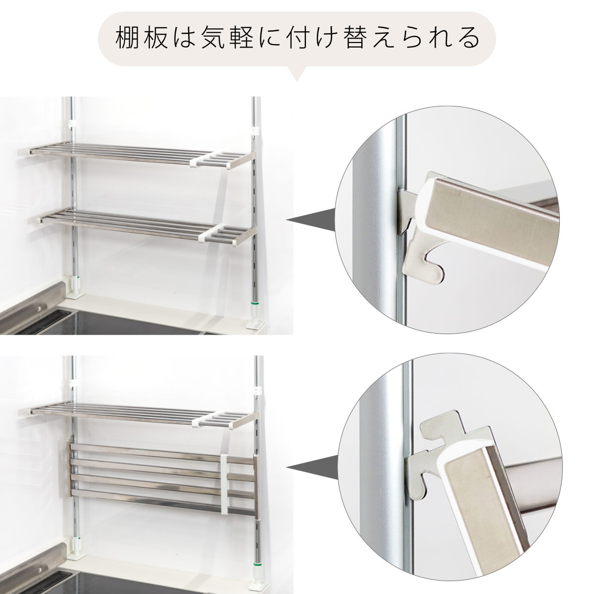 ●つっぱりに対して棚の高さを自由に調整できるので、使いやすいようにアレンジできます。
