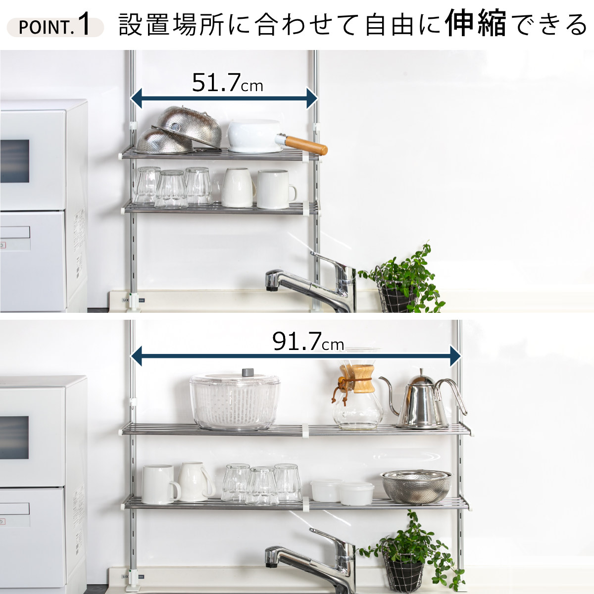 ●棚板は伸縮式なので取り付け場所の幅に合わせて調節可能です。