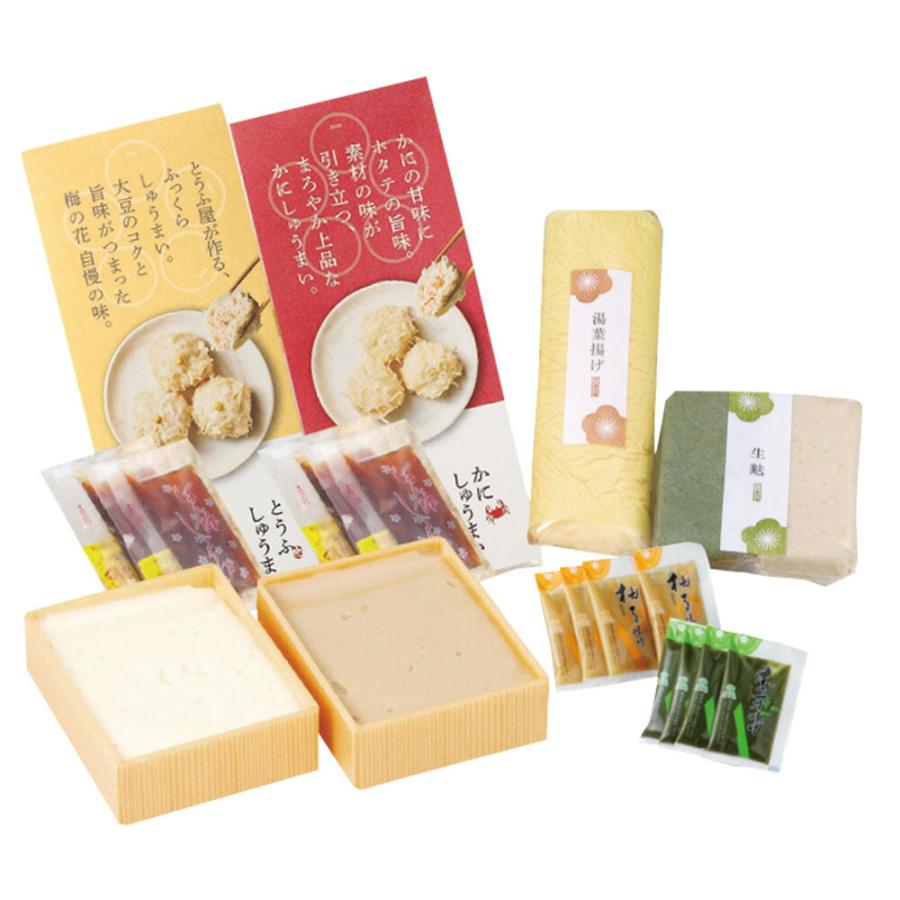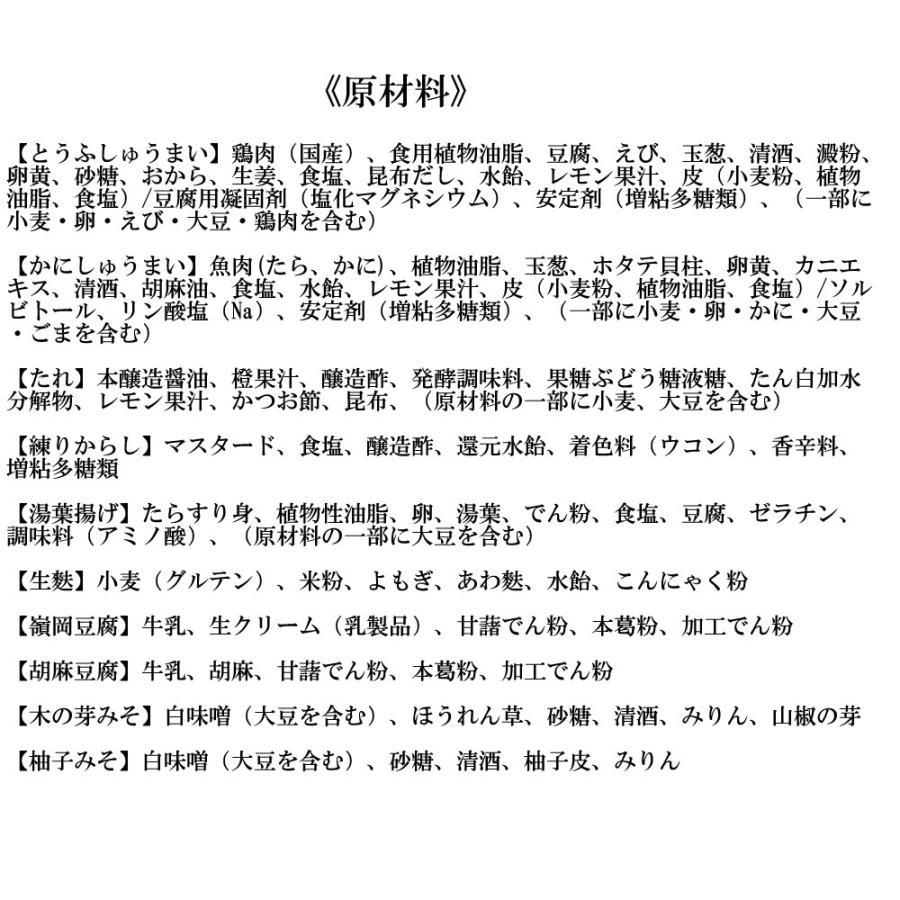 湯葉揚げ(1本)、生麩(220g)、胡麻豆腐(260g)、嶺岡豆腐(260g)、木の芽みそ(20g×4個)、柚子みそ(20g×4個)