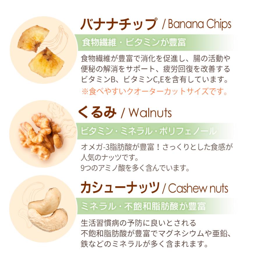 ● 原材料名:アーモンド(アメリカ産)、落花生、バナナチップ、くるみ、 カシューナッツ