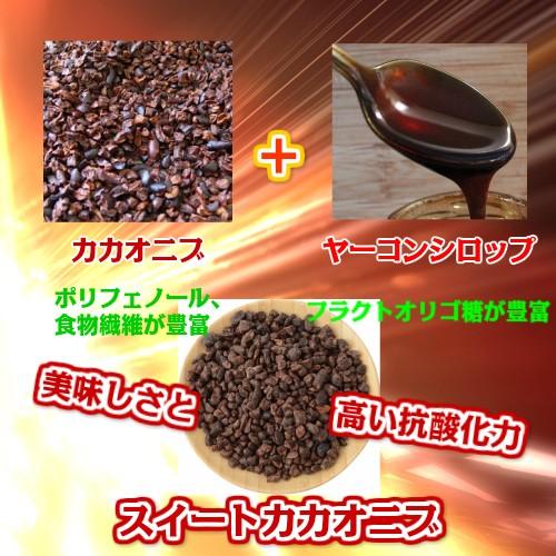 砂糖不使用のスウィートなカカオニブの販売を開始! カカオニブ自体の独特の苦みがあって食べずらいと言った声を頂き開発されました。砂糖不使用のとなりヤーコンシロップをコーティングして天然の甘みを出しております。