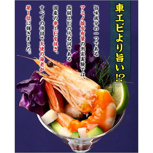 商品のポイント:天使の海老は一切の添加物を使わず、自然食のみで育てられています。限りなく天然に近い環境で養殖しているため、運動量も多く、殻が薄く身が締まっているのが特徴です。また、水揚げされた天使の海老は素早く選別され、生きている状態で、わずか10分という短時間で冷凍処理。旨味成分の一つであるアミノ酸含有量の測定実験では、高級エビの代名詞である国産の車エビをも抜き、すべての項目で第1位という結果になりました。