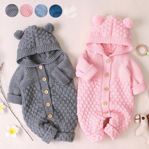 ロンパース ベビー 着ぐるみ ニット 赤ちゃん用ロンパース フード付き 女の子 男の子 ポンポン オーバーオール 幼児 子供服 可愛い カバーオール