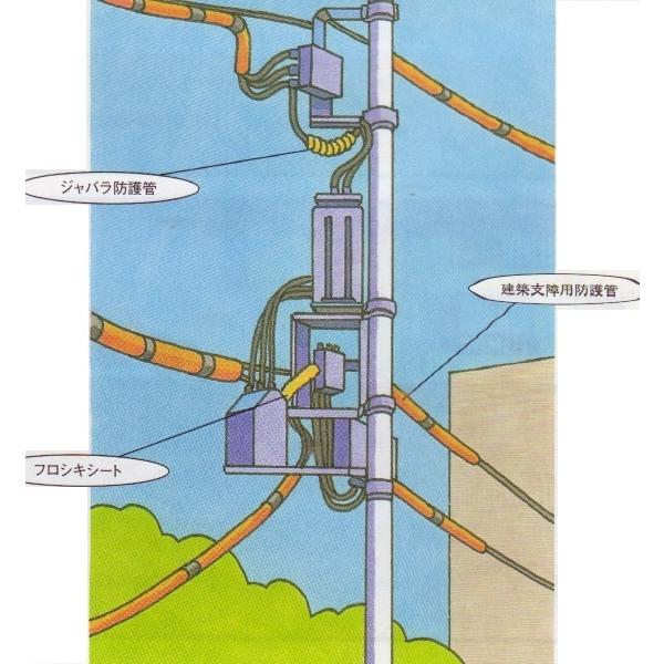 ジャバラ防護管φ45mm×5m巻7,000V以下 交流 黄色建設工事時に近接している電線・ケーブル等に一時的に取り付け、感電及び設備事故の防止をはかる為に使用します。縁廻り線やリード線の曲線箇所への取り付けに適しています。※直流7,000V以下でもお使い頂けます。特徴:●本管の断面が脱落防止構造となっている為、風圧や振動で電線から外れにくくなってます。 ●電線等に押し込みで挿入することが出来る腹割り構造になっています。●注:沖縄、北海道、離島および中継エリアは送料別途です。