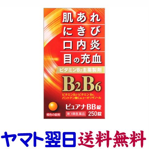 ★★南東北〜九州まで全国あすつく★★【第3類医薬品】市販薬 ピュアナBB錠は、肌荒れ、にきび、口内炎、目の充血など疲れた時に効果的なビタミンB2とB6が主配合の医薬品です。ビタミンB2が細胞の新陳代謝を助けて皮膚や粘膜の症状を改善するほか、皮膚のビタミンと呼ばれるビタミンB6、疲れによいビタミンB1やパントテン酸カルシウム、ニコチン酸アミドに加え、γ-オリザノールなどの有効成分が身体全体の働きを円滑に改善します。1回1錠を1日2回服用します。ジェネリック <米田薬品工業株式会社>【250錠入】