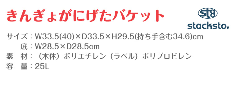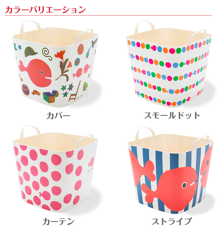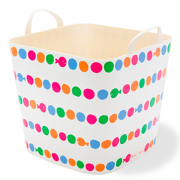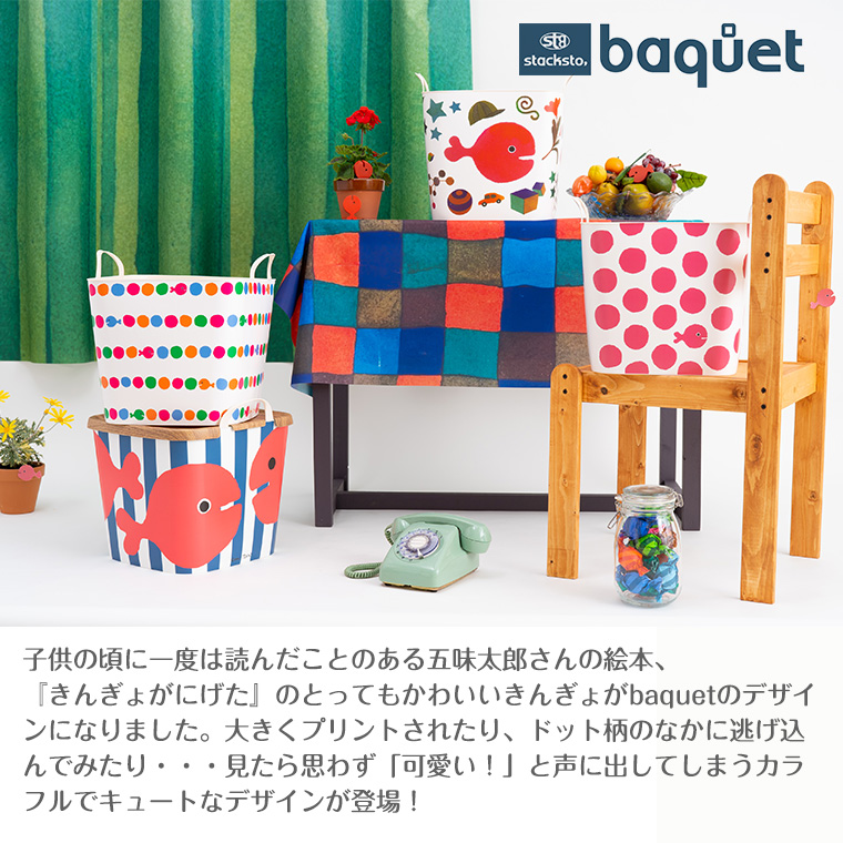 【特徴】子供の頃に一度は読んだことのある五味太郎さんの絵本、『きんぎょがにげた』のとってもかわいいきんぎょがbaquetのデザインになりました。大きくプリントされたり、ドット柄のなかに逃げ込んでみたり・・・見たら思わず「可愛い!」と声に出してしまうカラフルでキュートなデザインが登場!【サイズ】(M/25L)高さ29.5×幅33.5×奥行33.5cm(取っ手部分高さ)5.1cm【素材】(本体)ポリエチレン…100%ヴァージン素材 (ラベル)ポリプロピレン