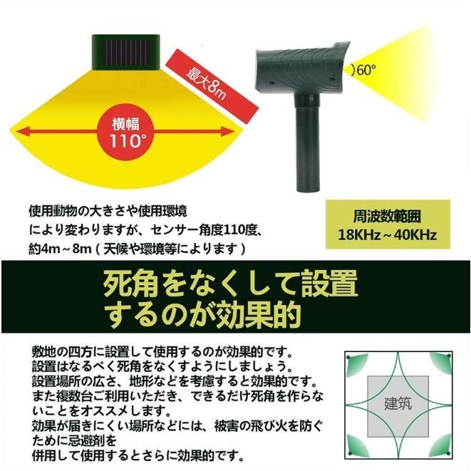 ・動物の嫌がる高周波数の音で動物が慣れることを防ぎ、近づくこと=恐いと感じさせることで、その後に周辺に近づくことを防ぎます。