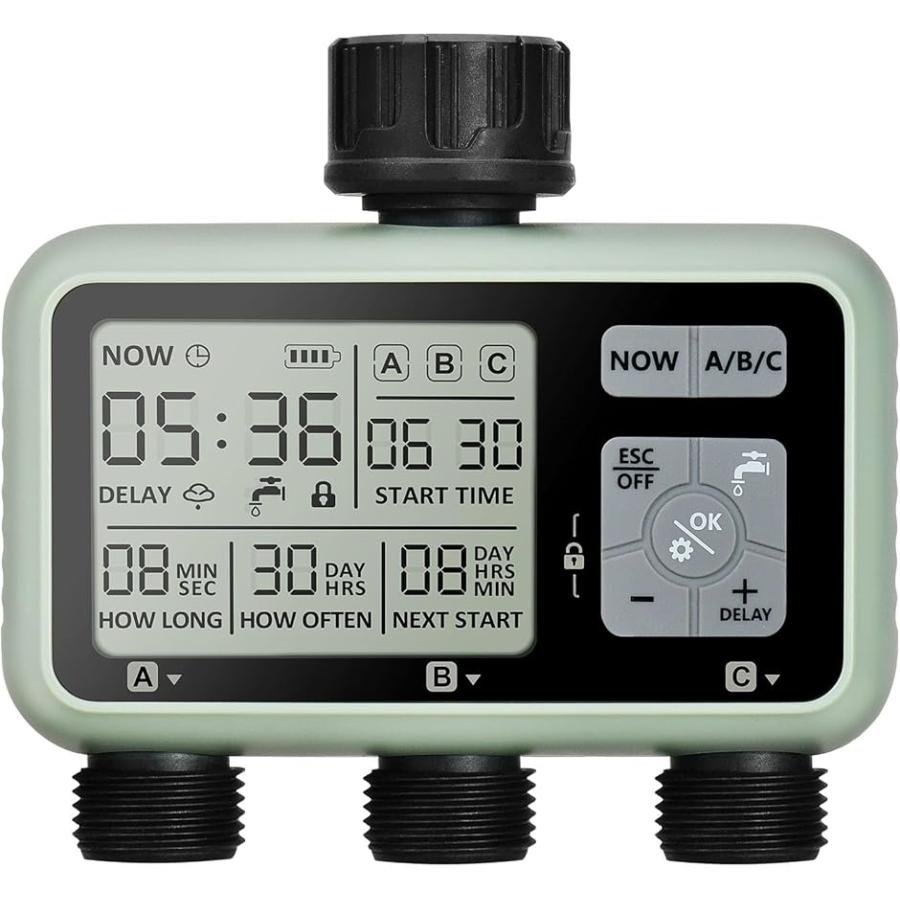 「3つの独立した散水エリア&真鍮材料インターフェイス」:この新しくアップグレードされた灌漑システムは、3つの独立したバルブが装備されている、あなたはより柔軟にあなたの散水計画を設定し、1台のマシンのデュアル-目的機能を実現することができます。