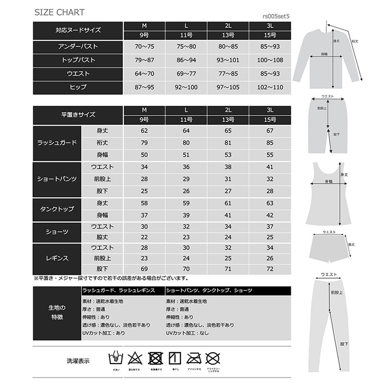 UVカットラッシュガード・ショートパンツ・上下タンクトップ水着・ラッシュレギンスのお得な5点セット