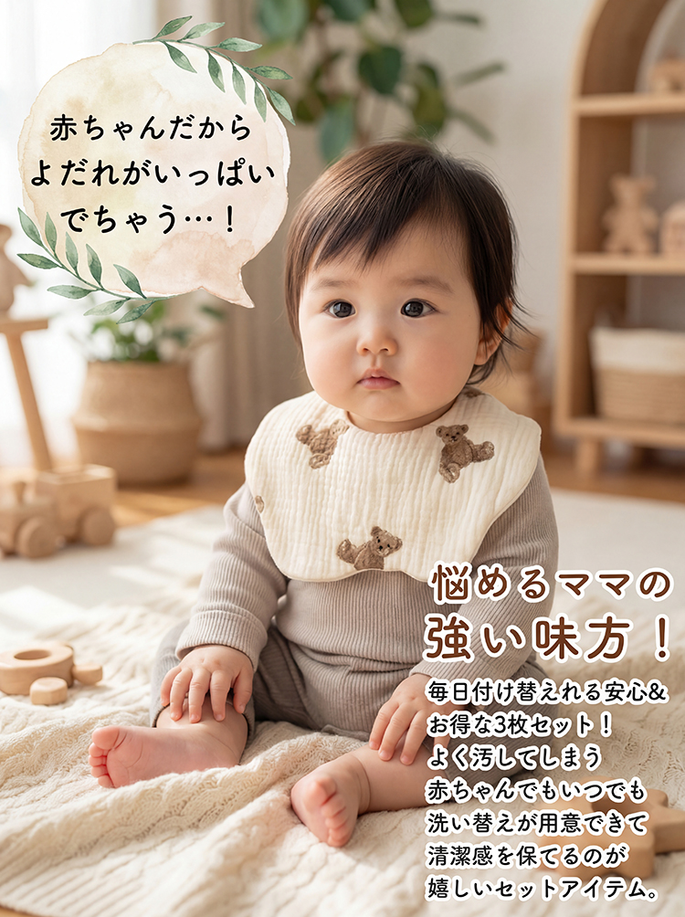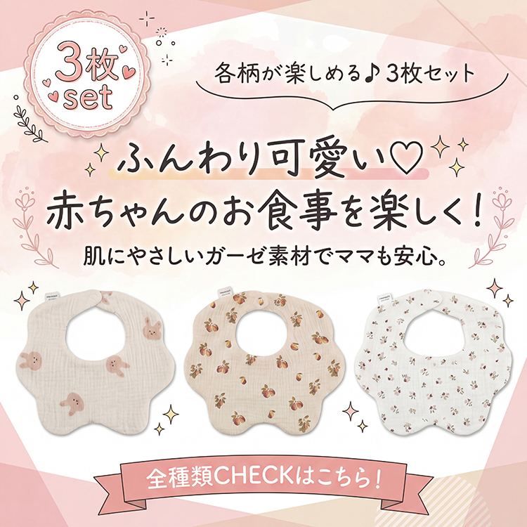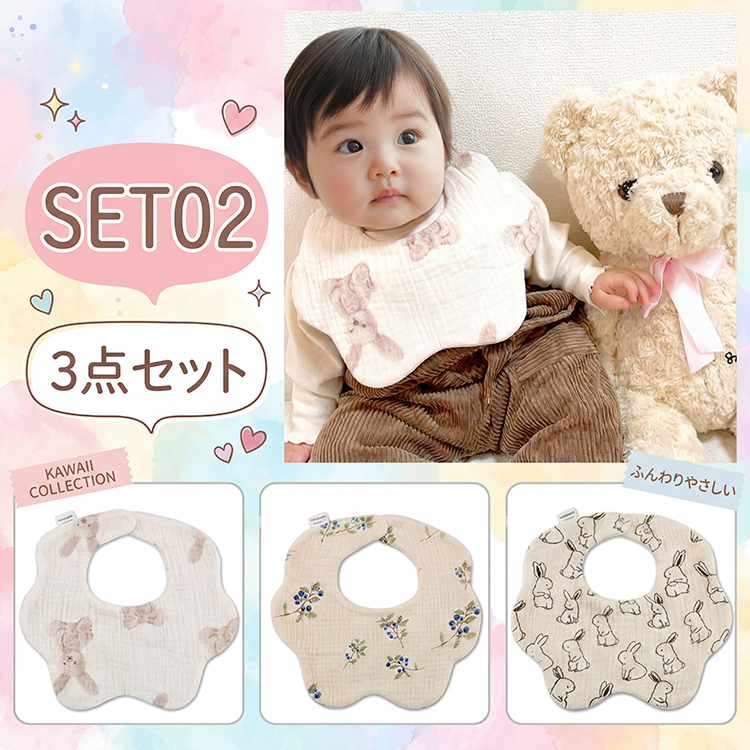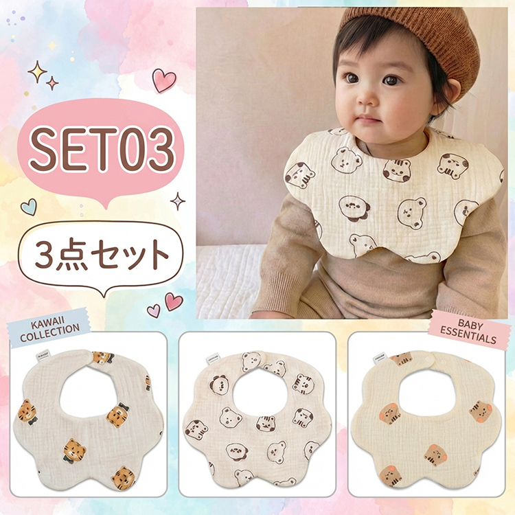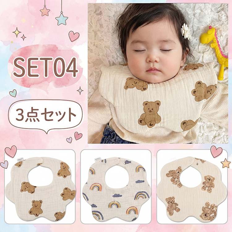 商品名 : ベビー スタイ よだれカバー 3種セット素材 : 綿 100%サイズ : 約 22 x 23cmタイプ : セット1 ~ 5※ 生産時期により、色・サイズ・デザインが異なる場合がございます。あらかじめ御了承下さい。ベビー スタイ よだれカバー 3種セット ベビー 赤ちゃん 子供 出産祝い スタイ よだれかけ スタイセット 3種セット 360度 よだれカバー ベビー スタイ ギフト よだれかけ 女の子 男の子 かわいい プレゼント 爆買