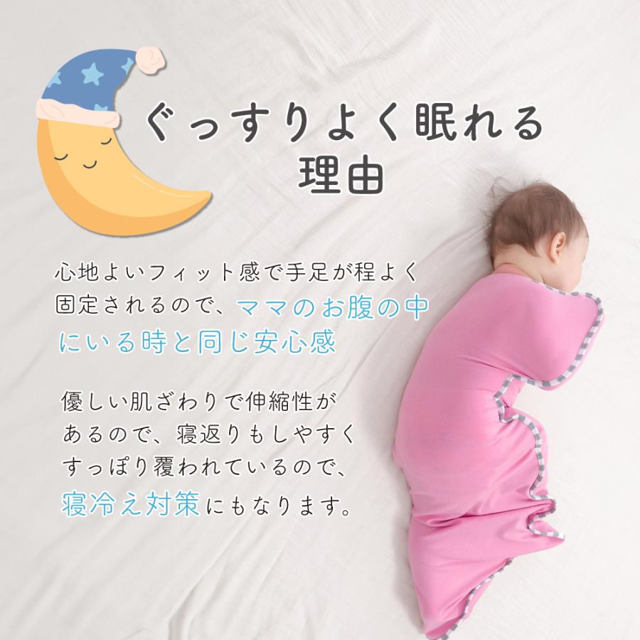 赤ちゃんの体を手足まですっぽりと包み込む形状により嬉しいポイントがたくさん。
