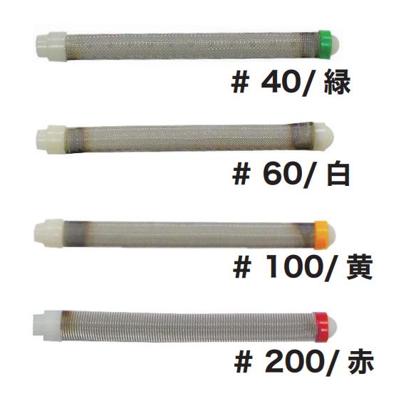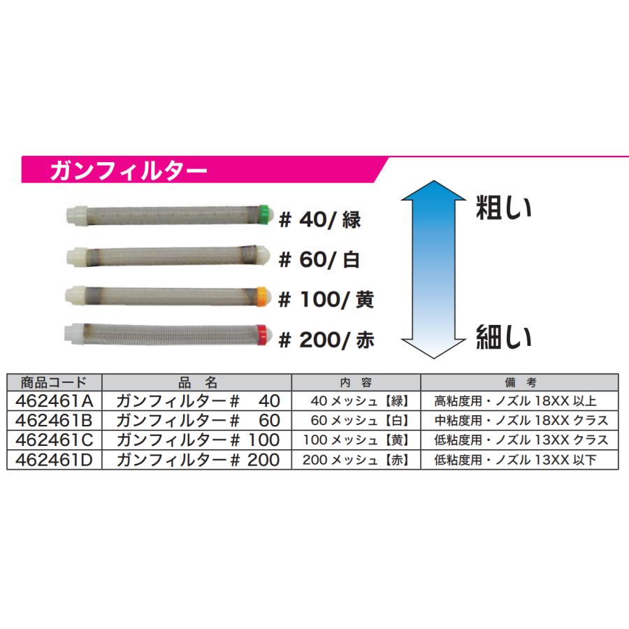 精和産業 ガンフィルターになります。・ガンフィルター #40 #462461A 40メッシュ(緑)高粘度用・ノズル18XX以上・ガンフィルター #60 #462461B 60メッシュ(白)中粘度用・ノズル18XXクラス・ガンフィルター #100 #462461C 100メッシュ(黄)低粘度用・ノズル13XXクラス・ガンフィルター #200 #462461D 200メッシュ(赤)低粘度用・ノズル13XX以下