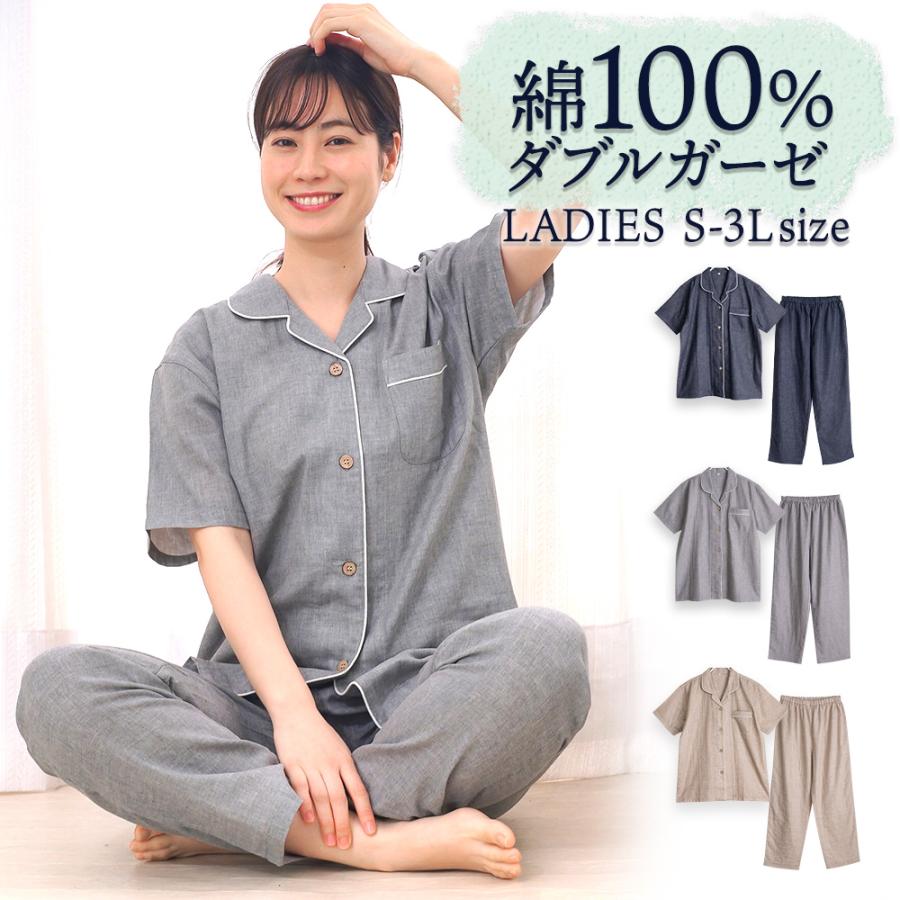 パジャマ レディース 綿100% ダブルガーゼ 半袖 春 夏向き 前開き シャツ 無地 S M L LL 3L かわいい おそろい ペア プレゼント 母の日