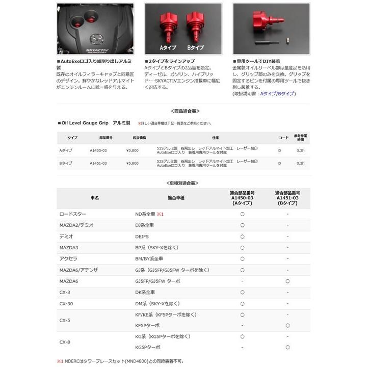 量産オイルレベルゲージの樹脂製グリップ部をクラフトマンシップ溢れるアルミ製に交換するアイテム。レッドアルマイト加工とレーザー刻印されたAutoExeロゴがエンジンルームにメカニカルで華やかなアクセントを与える。付属の専用ツールによりDIY装着が可能。SKYACTIVエンジン搭載車に幅広く対応する