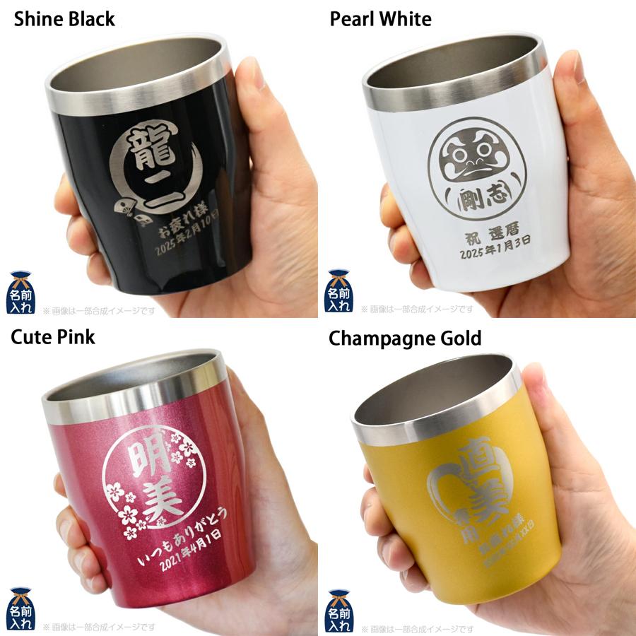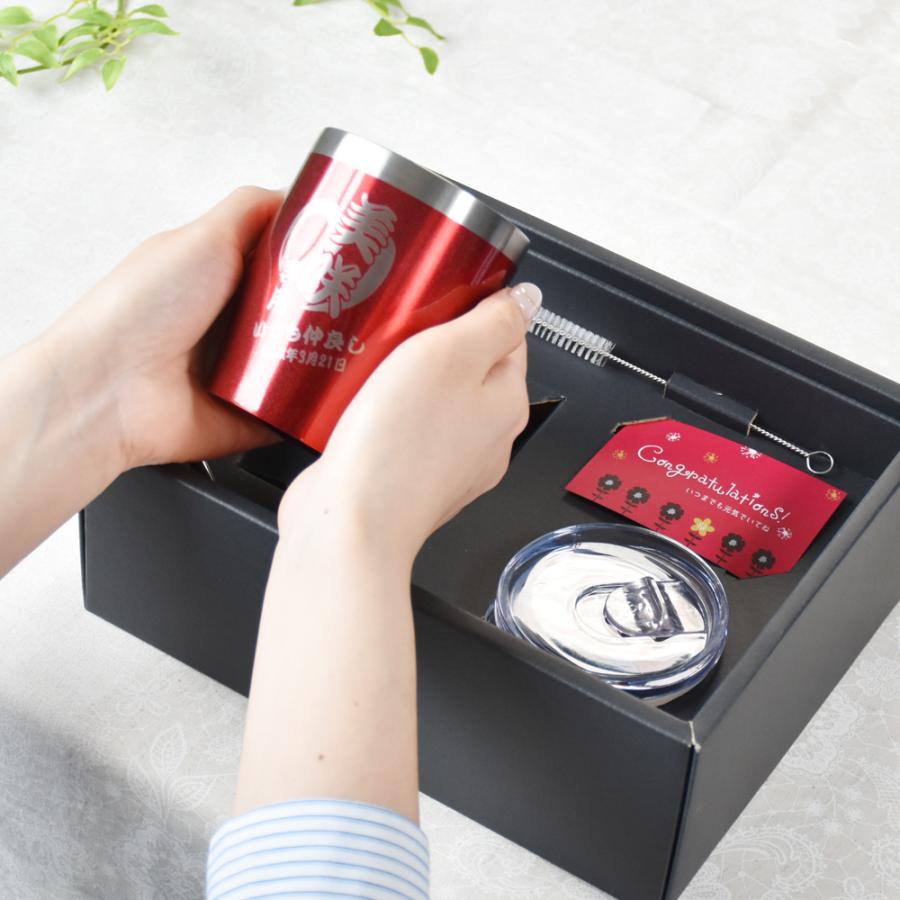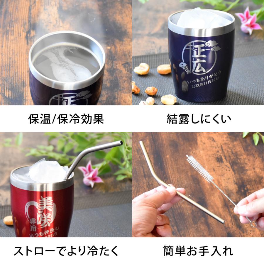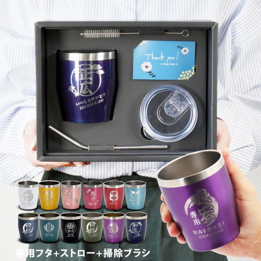 名入れ対応の真空ステンレスカラータンブラーと専用のフタ・ストロー・掃除用ブラシのセット商品です。