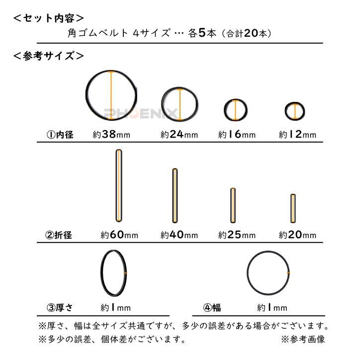No-7722■商品内容:角ゴムベルト4サイズ x 各5本■カラー:ブラック■サイズ:内径…約38mm 約24mm 約16mm 約12mm 厚さ…約1mm 幅…約1mm 折径:約60mm 40mm 25mm 20mm ※サイズには多少の誤差がございます。●4種類のサイズが各5本入りの20本セットです。複数のサイズがお試しいただけます。●カセットやCDデッキなどのオーディオ機器の修理・交換等にご使用いただけます。 ※オーディオ機器によってはご使用いただけない場合があります。