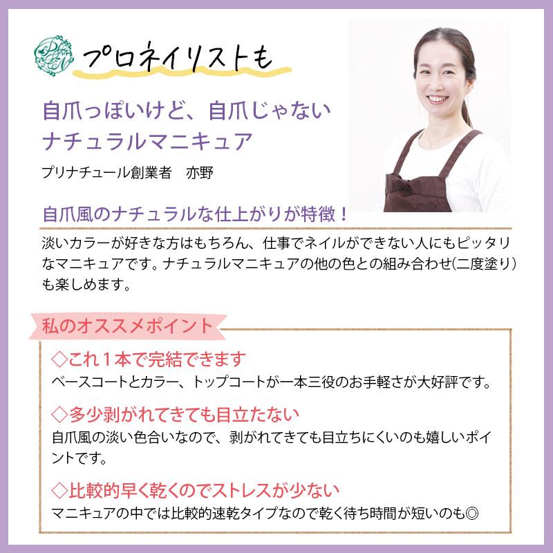 全国12店舗の自爪とネイルケア専門サロン「プリナチュール」が自爪をより美しく見せるために開発した自爪派のための自爪風マニキュアです(全7色)。