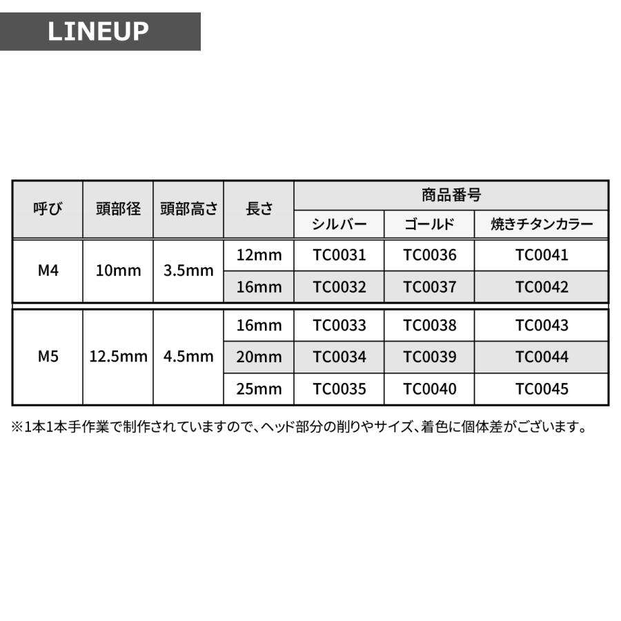■商品番号 TC0041■商品名 ステンレス ステップヘッド タッピングネジ■数量 1個売り■材質 ステンレス■頭部穴形状 六角穴付き■適合工具 六角レンチなど■商品サイズ M4×12mm 詳細は画像に掲載)■商品カラー 焼きチタンカラー ※サイズやカラーごとに価格が異なる為、購入後の商品の変更はできません。爆買