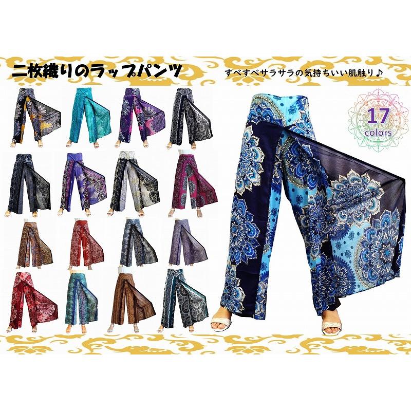 ヨガや部屋着、ベリーダンス・イベント衣装・旅行用・お店の制服や、ちょっとした外出時にもさらっと履けてオシャレな二枚織りのラップパンツになります。 通気性がよく肌触りがいいので、夏場はヘビロテ間違いなしです。 商品名 ラップパンツ 商品特徴 サラサラすべすべの履き心地♪ ヨガや部屋着、ベリーダンス・イベント衣装・旅行用としても向いています。モデルの身長は165cmです。 ※※色落ちする場合がございますので分けての洗濯をおすすめします※※ 素材 レーヨン100% サイズ ウエスト平置き:33cmから40cm(バックにゴムが入っているのでウエスト80cm程までは対応できます) 股上36cm 股下58-62cm フリーサイズ ※サイズは平置き、メジャー採寸です。カラー :全17色 ●生産過程において細部にわたり若干縫製の乱れ等ある場合がございます。明らかに品質上に問題があると思われる場合を除き、良品の範囲内とさせて頂いております。 ●素材・染料の性質上、色落ちする場合がございますので他の物とは分けて洗って下さい。 お洗濯の際には手洗いをお勧めします。 また お洗濯により若干縮む場合がございます。