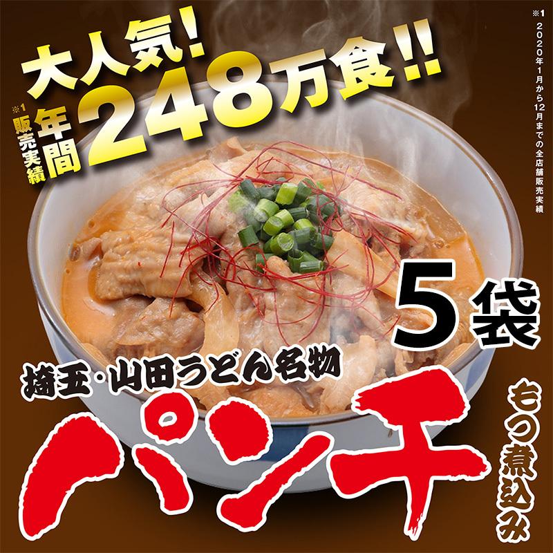 埼玉県のローカルチェーン店、ファミリー食堂山田うどん食堂の名物メニュー「パンチ」は、40年以上お店で販売を続けているロングセラー商品のもつ煮込みです。山田うどん食堂に来店される多くのお客様に愛されご注文をいただいている不動の人気メニューです!お湯で温めるだけのかんたん調理なので、おかずにもう一品もつ煮を追加など食卓の様々なシーンでご利用頂けます。こちらの商品はパンチ(もつ煮込み)5袋セットになります。