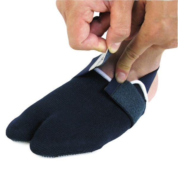 足袋型サポーターです。日本製底部分は、<皮革と帆布製>から選択できます。・滑りにくいのは、皮革製(試合不可)・試合用には、帆布製足運びをやり易く、足裏の皮の傷みも軽減いたします。剣道をしていると床との摩擦でどうしても足裏皮が破れて新しい皮が出来るまで非常に痛い思いを致します。そういった傷みを軽減、予防するためのサポーターです。