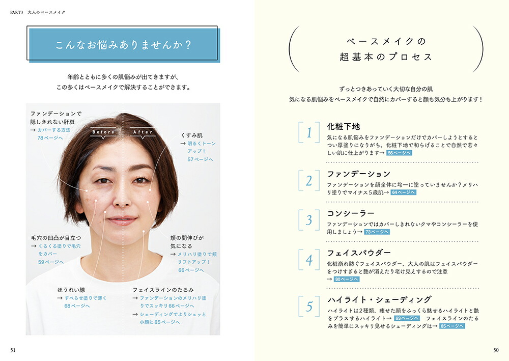 大人の悩み「毛穴」「肝斑」「たるみ」「くすみ」に対応したメイク術。今までのメイクを見直してみませんか?元資生堂トップメーキャップクリエイター、大人メイク専門家、由比ちえ初のメイク本。