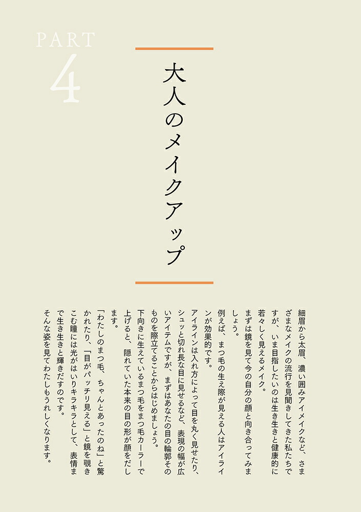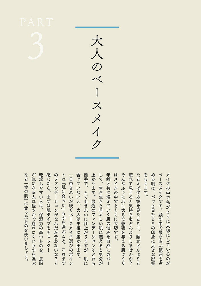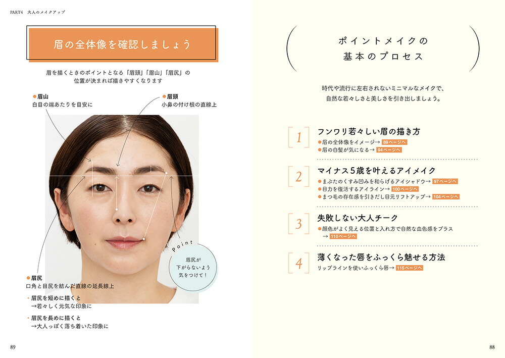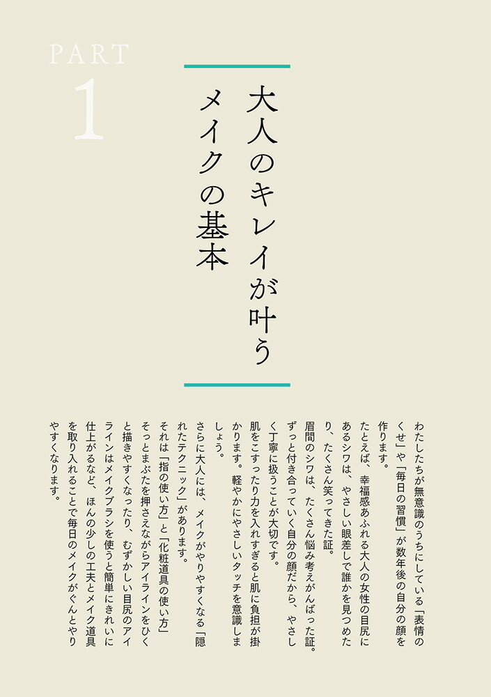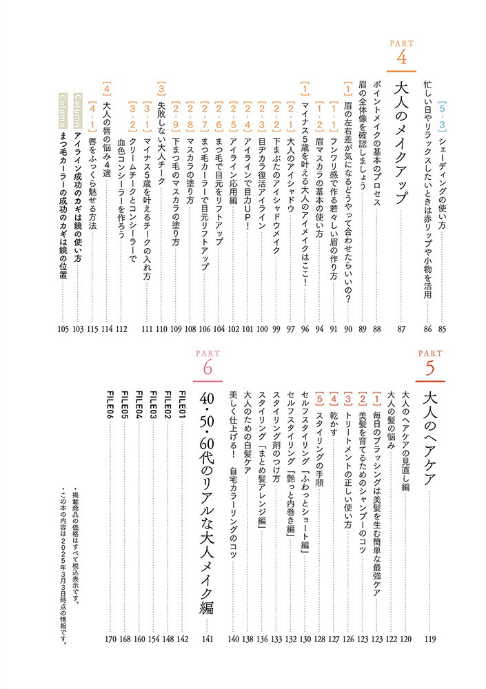 1 大人のキレイが叶うメイクの基本/2 大人のスキンケア/3 大人のベースメイク/4 大人のメイクアップ/5 大人のヘアケア/6 40・50・60代のリアルな大人メイク編