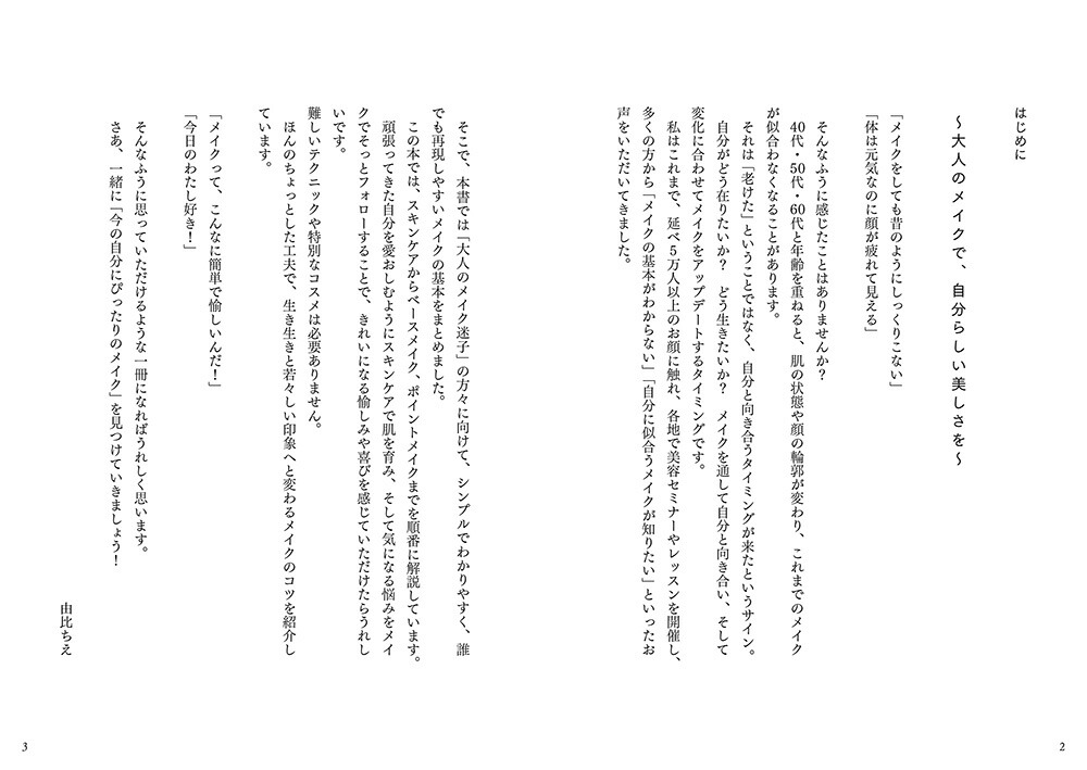 由比ちえ(ユヒチエ)大人メイクの専門家。美容家歴27年、延べ5万人を美しくしてきたメイクのプロフェッショナル。美容部員として百貨店で活動後、資生堂トップメーキャップクリエーターとして国内外のビューティーイベントなどで活躍。現在は40・50・60代の「大人メイクのお悩み」を解消するため、化粧道具やコスメの選び方から使い方までを分かりやすく提案。メーカーの垣根を越えた厳選コスメを紹介しながら、自分らしくのびのびと大人を愉しむメイク術を発信している。自身初の著書となる本書は、長年の経験をもとに、大人世代が自分らしく輝くためのメイクのコツを詰め込んだ一冊となっている(本データはこの書籍が刊行された当時に掲載されていたものです)