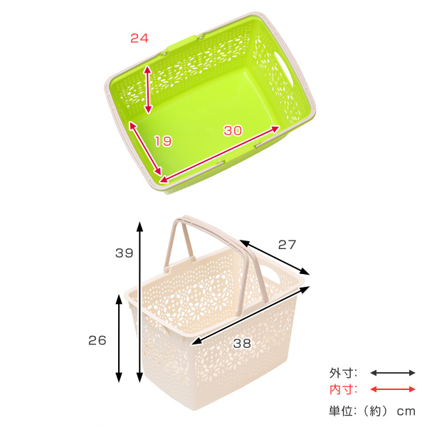 お買い物かごに、マイバスケットに便利な花柄模様でおしゃれなデザインバスケットです。従来のショッピングバスケットより小ぶりなものがほしい…(続きは下に) 【商品詳細】サイズ/外寸:約幅38×奥行27×高さ26cm 内寸:約幅30×奥行19×高さ24cm 内容量/1個 材質/ポリプロピレン 種類/アイボリー、ライムグリーン、ディープピンク、ブラウン 生産国/日本製 《レジャー アウトドア キャンプ 屋外 買い物 ショッピング 花柄 レジかご レジャー用品 レジャーグッズ カー用品 収納用品 キッチン収納 キッチンストッカー キッチン 買い物バスケット 買い物カゴ マイバスケット マイエコバッグ エコ バッグ エコバック ランドリーバスケット カラーボックス インナーボックス インナーケース インボックス 洗濯物 洗濯カゴ 洗濯かご 洗濯 籠 バック 買物 ピクニック 持ち運び おしゃれ オシャレ 大人カワイイ 大人かわいい オモチャ箱 おもちゃ箱 オモチャ入れ おもちゃ入れ おもちゃ収納 オモチャ 玩具 おもちゃ 整理整頓 整理 整頓 片付け 可愛い かわいい 使いやすい オススメ おすすめ アイボリー ライムグリーン ピンク ブラウン 緑 茶 色 LH6202》