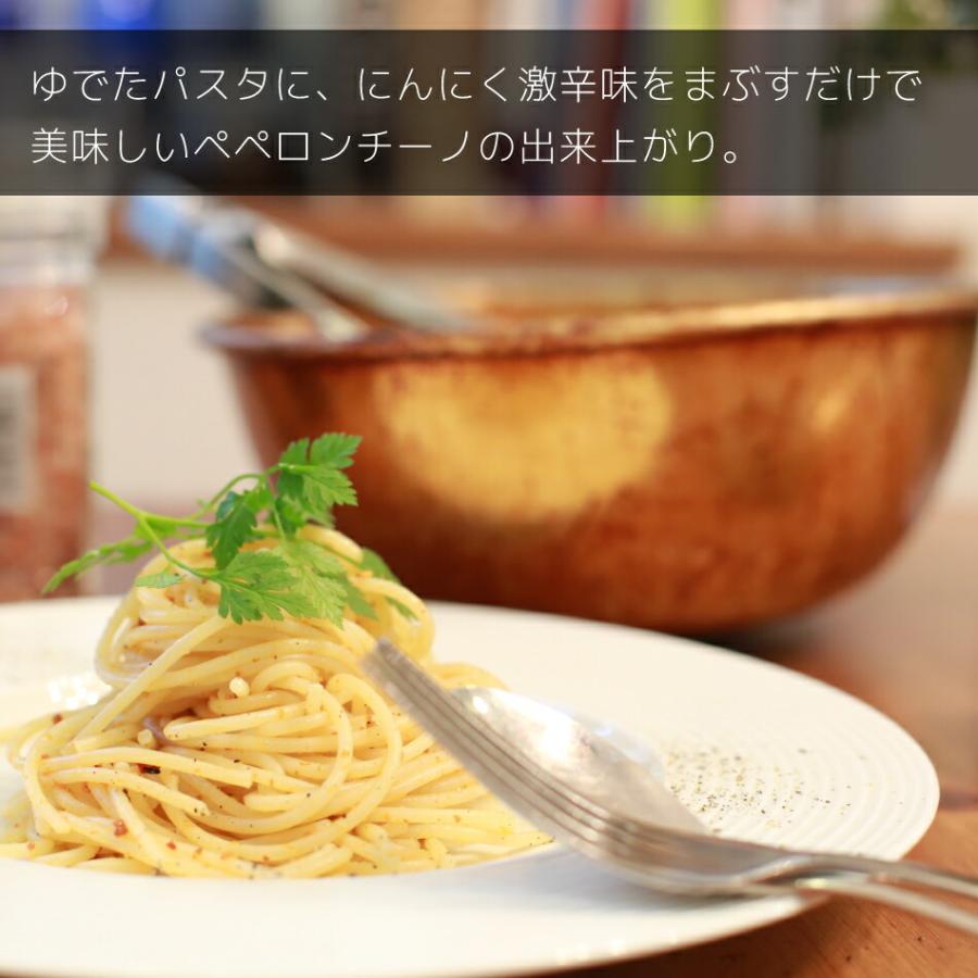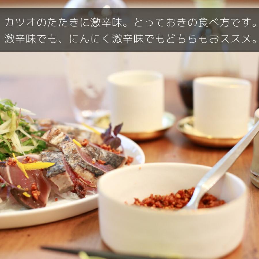 激辛味とにんにく激辛味、どちらも和、洋、中、すべての料理に合う万能調味料として辛いのが苦手な人でも少量使いでおどろくほどの風味とコクが出ます。にんにくと胡麻のバランスが絶妙な辛味。