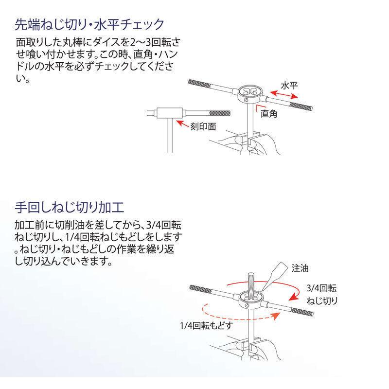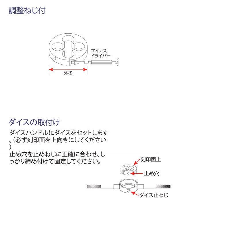 ボルトなどのオネジの加工やオネジの山を修正する時に使うネジ切り用丸ダイスです。ダイスハンドルと組み合わせてご使用ください。※ステンレス製のねじ類には、使用できません。