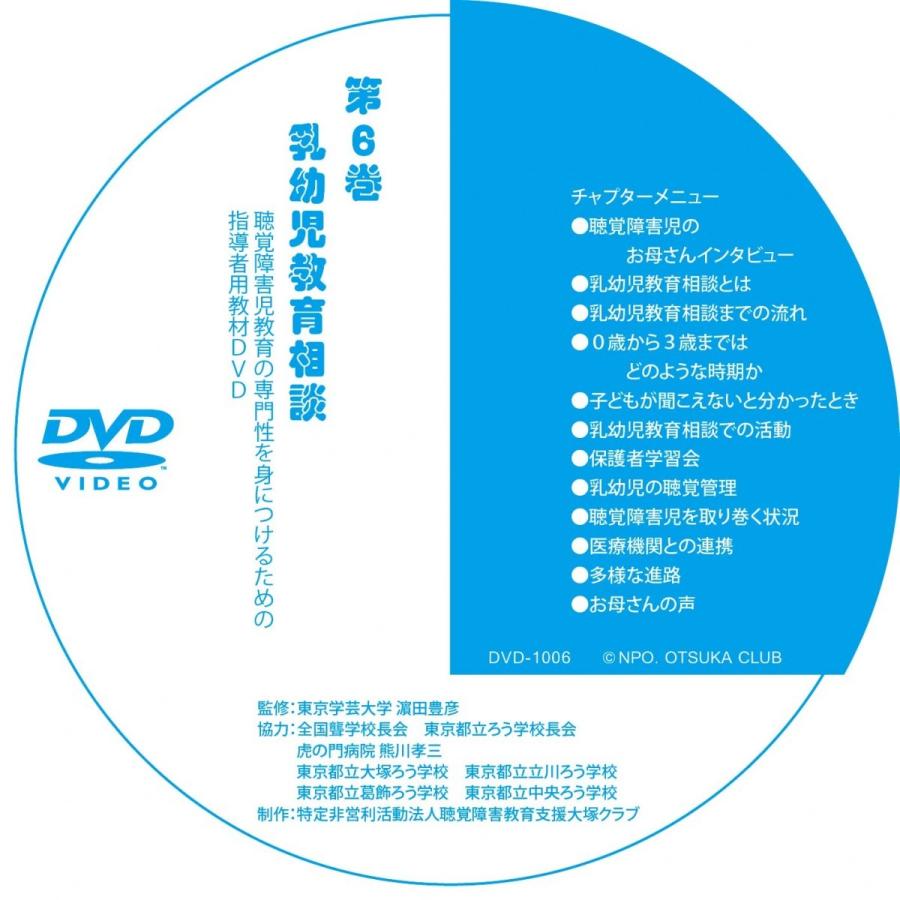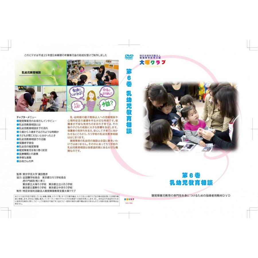 聴覚障害児教育の専門性を身につけるための指導者用教材DVDシリーズの第6巻「乳幼児教育相談」編です。テキストブックは大塚クラブホームページから無料でダウンロードできます。この商品は、ライセンスに基づいてコピーしたDVD-R版です。パソコンでの再生は確認しておりますが、一部のDVDプレーヤーで再生できないとの報告もあります。DVDメディアの不良による交換は賜れますが、相性による返品には応じられませんので、予めご了承ください。