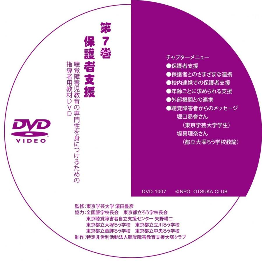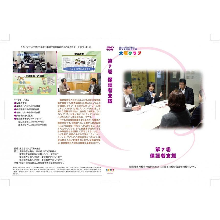聴覚障害児教育の専門性を身につけるための指導者用教材DVDシリーズの第7巻「保護者支援」編です。テキストブックは大塚クラブホームページから無料でダウンロードできます。この商品は、ライセンスに基づいてコピーしたDVD-R版です。パソコンでの再生は確認しておりますが、一部のDVDプレーヤーで再生できないとの報告もあります。DVDメディアの不良による交換は賜れますが、相性による返品には応じられませんので、予めご了承ください。