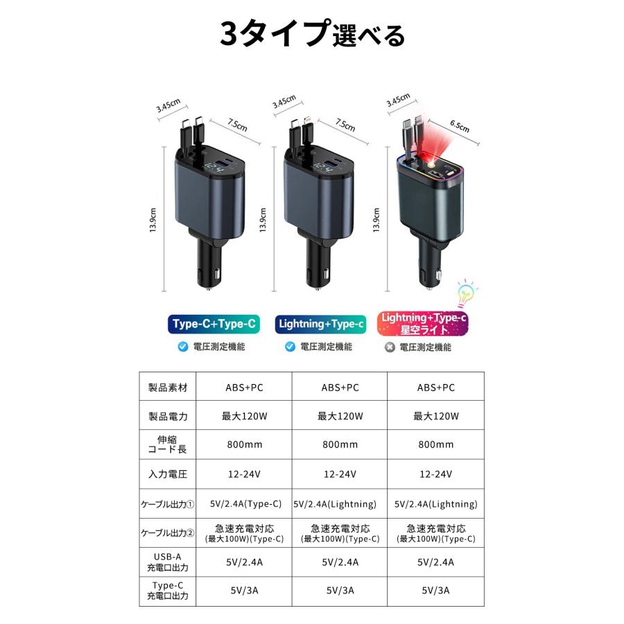 新版シガーソケットは2USBポート+80cmの伸縮式ケーブル2本付き(MAX 120W)の高速充電を装備。