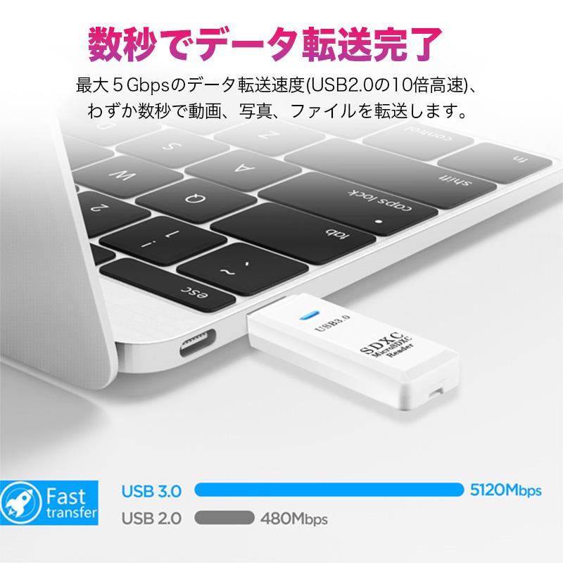 USB3.0 5Gbpsのスーパースピードに対応、約10倍の転送速度を実現します。高解像度の写真やHD動画はPCやノートパソコンに短時間で転送できます。