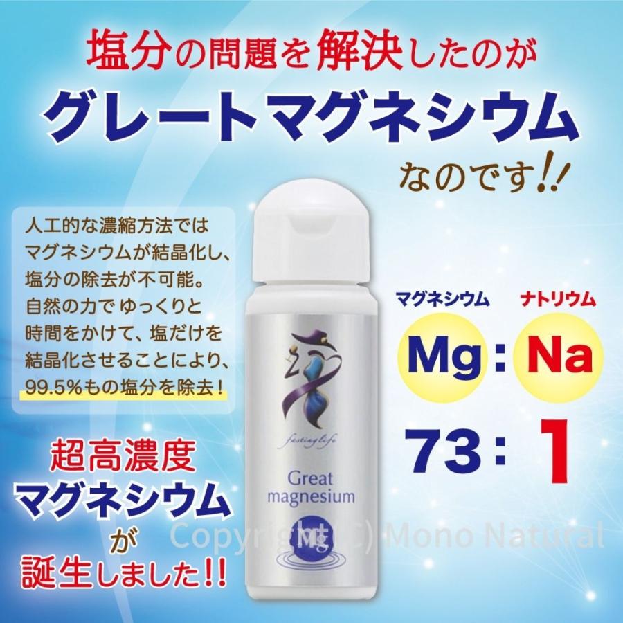 自然の力に委ねる製法で、「マグネシウム:ナトリウム=73:1」という高濃度化を実現しています。水溶性で、食品に混ぜるなど調味料のようにも使えます。