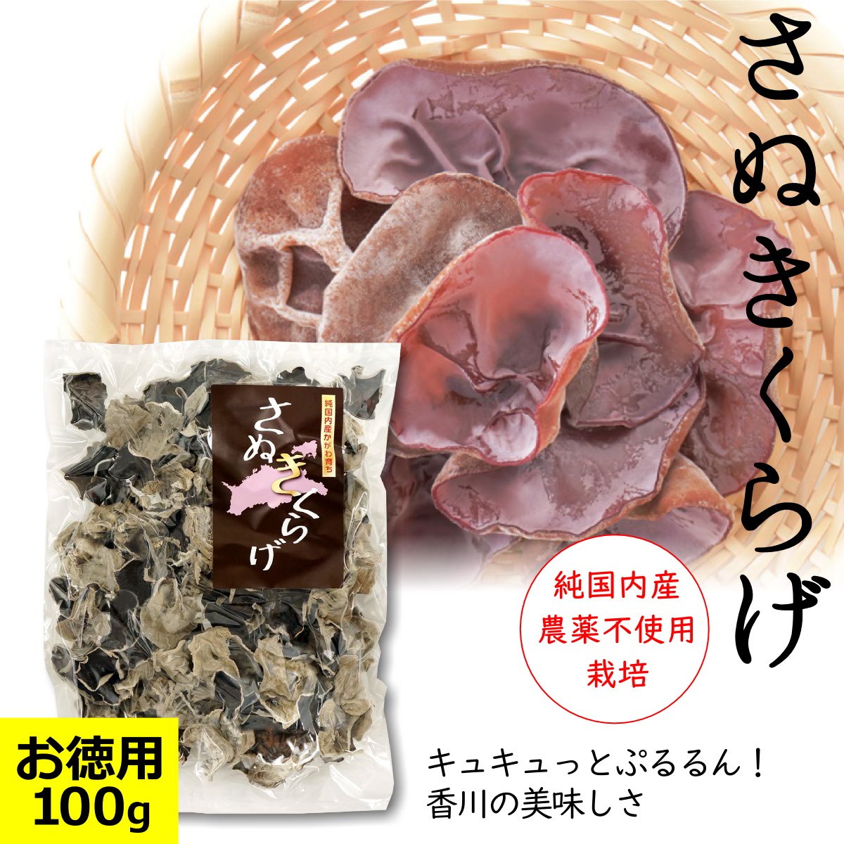 【たっぷり入ったお徳用】厳重な管理の下で丁寧に育てられた肉厚の国産きくらげを、天日干しで乾燥させました。クセが少ないので、中華料理だけでなくスープやサラダ・酢の物などいろいろなお料理にお使いいただけます。低カロリーな上に食物繊維やビタミンDなど、健康な体に必要な栄養素がたっぷり詰まっています。■商品内容:さぬきくらげ (丸) 100g 袋入り■配送便:通常便