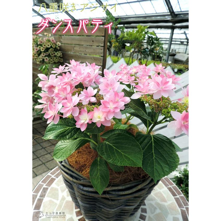 「ダンスパティ」は、最近人気急上昇中のガクアジサイ。八重咲きの装飾花、細長い花弁は優雅で華やかさもあります。花色は 土壌PHや日照によって変わるので、その変化をつける楽しみもあります。また、開花後そのまま切らずにおくと、色素が落ちて花弁が淡緑色に変わります。多花性で、鉢植えはもちろん、庭植えでも異彩を放つ、一押しアジサイです。※4月以降のお届けは、剪定した状態でお届けすることがあります。生育した来年も開花をお楽しみいただけます。
