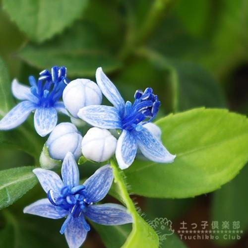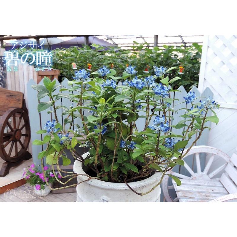碧の瞳(あおのひとみ)は、青色が美しい常緑アジサイで、珍しい品種です。 アジサイとしてはちょっと控えめな印象がある花ですが、ブーケや切り花の素材としても大変お奨めです。 爽やかな花色もさることながら、その後の目の覚めるような青い実がとても美しく、おそらくこの実が「碧の瞳」の由来でしょう。寒さに強く、常緑なので冬の落葉樹独特の“ちょっとさびしい感じ”がしないところもイイですね。※秋冬になると全体が紫がかった色に変色します。4月頃より気温が高くなくると新芽も芽吹き自然と葉色も戻ってきます。