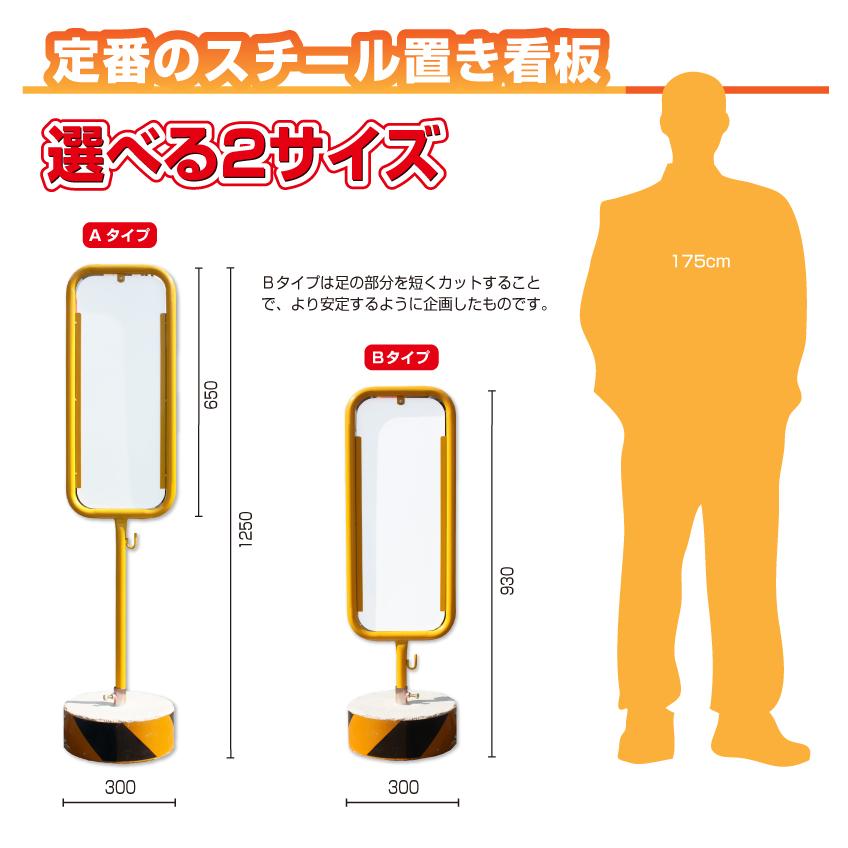 爆買■広告面:H650×W280mm(両面広告) ■材 質:黄色の鉄枠製 ■高 さ:(Aタイプ1250mm・Bタイプ930mm) ■パイプ直径:約25mm ■総重量:約16.5kg(ブロック重さ:約14.2kg) ■コンクリートブロック付き 直径約280mm●高さが選べる2タイプ ●馴染みのある定番の丈夫な鉄枠製置き看板※土台に使用しているコンクリートの性質上、欠けが生じる場合があります。