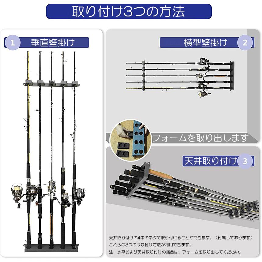●取り付けが簡単:釣り竿収納ラックは、垂直壁取り付け、水平壁取り付け、または天井取り付けの4本のネジで取り付けることができます。これらの3つの取り付け方法が利用できます。注:水平および天井取り付けの場合は、フォームを取り出してください。