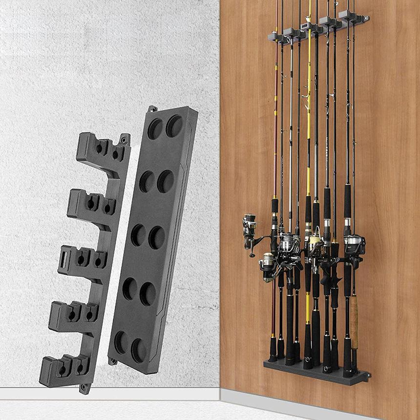 ●小型、大収納:釣り竿ラックは最大10本の釣り竿またはリールコンボを収納できます。内側の列にリールのない5本の釣り竿、前列にリールのある5本の釣り竿を収納することをお勧めします。サイズは小さいが収納スペースが大きく、床面積を節約できます。ガレージの保管やタックルルームなどに最適です。