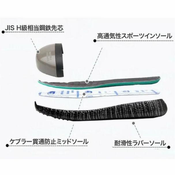 一見るとスニーカーように見えますがが、先芯入りでつま先保護です更にケブラー繊維採用して踏込み防止ですが全面的に足への保護を提供<br>